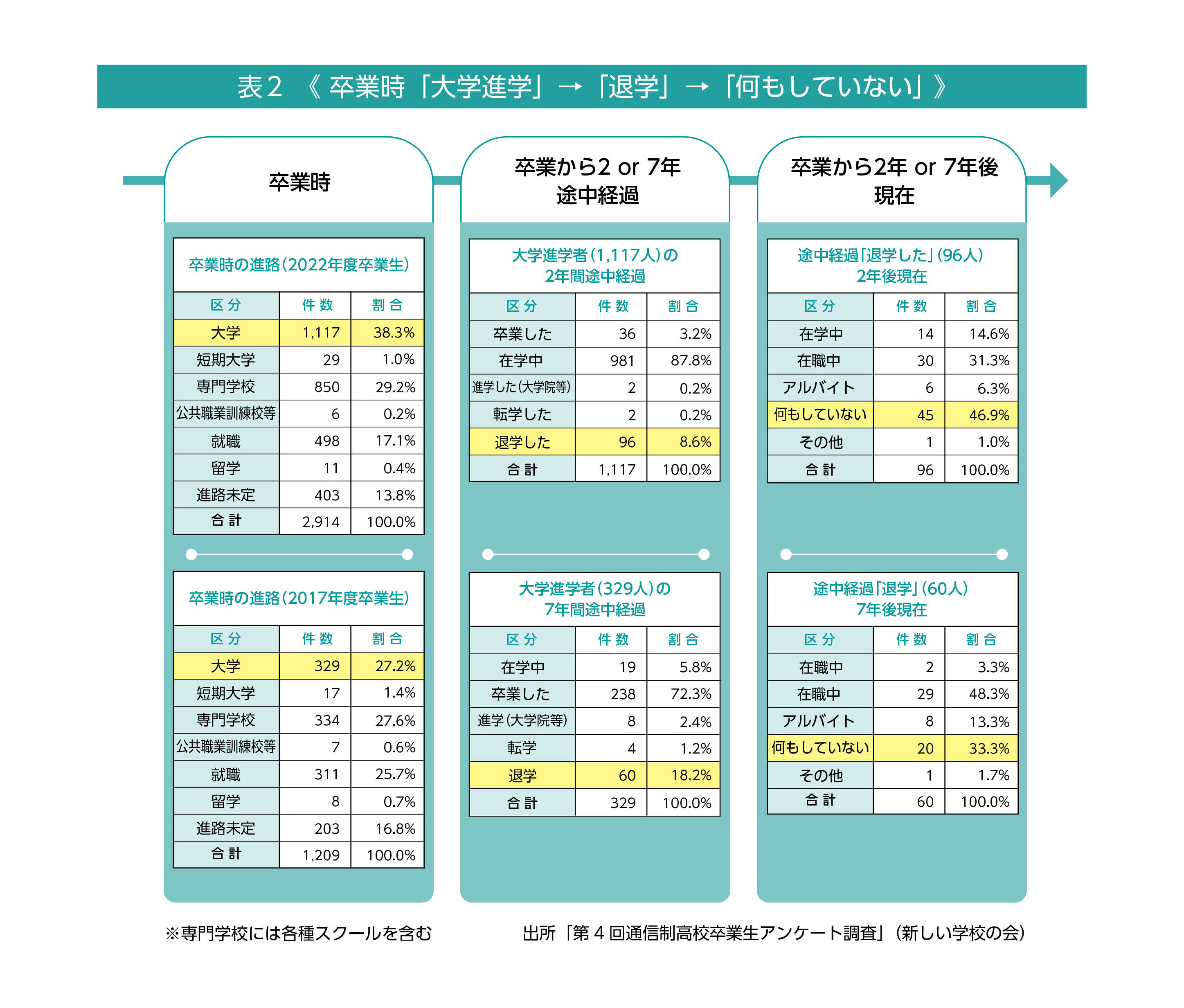 例えば大学進学後も波があります。下の表は、私が事務局長を務めている通信制高校等の団体「新しい学校の会」が行った通信制高校卒業生アンケート調査です。大学退学率が一般学生の2~3%に比べると、通信制高校卒業生は卒業2年度・22年度卒業生で約9%、同7年後・17年度卒業生で約18%と高くなっています。さらに大学退学後「何もしていない」(バイト等もしていない)とする人が調査時点現在で前者約47%、後者約33%となっています。かなり苦しい状況の人が多いと推測できます。